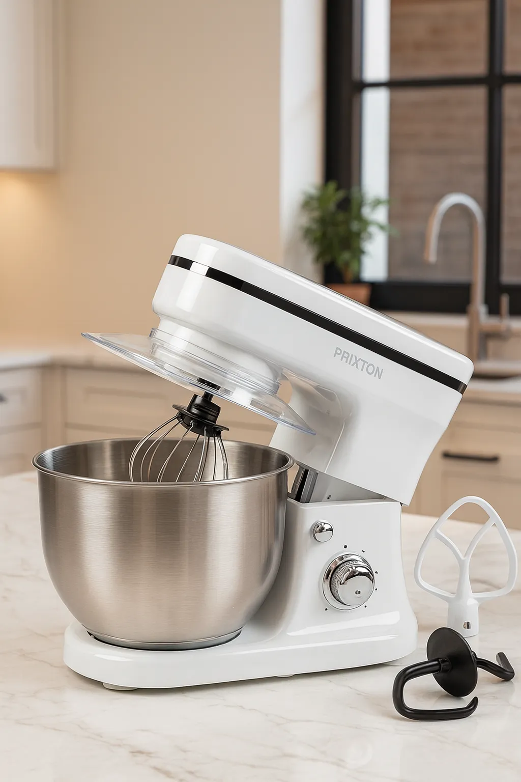 PRIXTON Mixeur Pétrisseur KR200 — 1200 W, 5 L, 6 vitesses, 3 accessoires, Couvercle Transparent (Blanc)